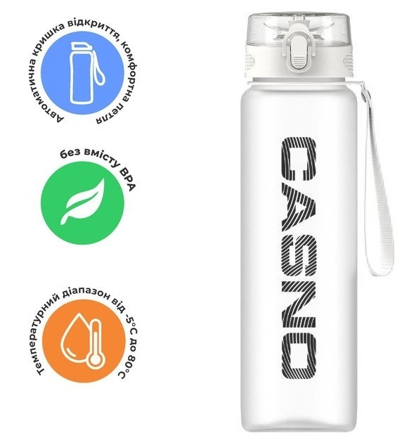 Casno – бутылка для воды, изготовленная из качественного пластика, она не имеет постороннего запаха, удобна в использовании, безопасна для здоровья. Она идеально подходит для пеших прогулок, езды на велосипеде, кемпинга, трекинга, бега, йоги и любых других видов спорта дома, в тренажерном зале и в офисе.