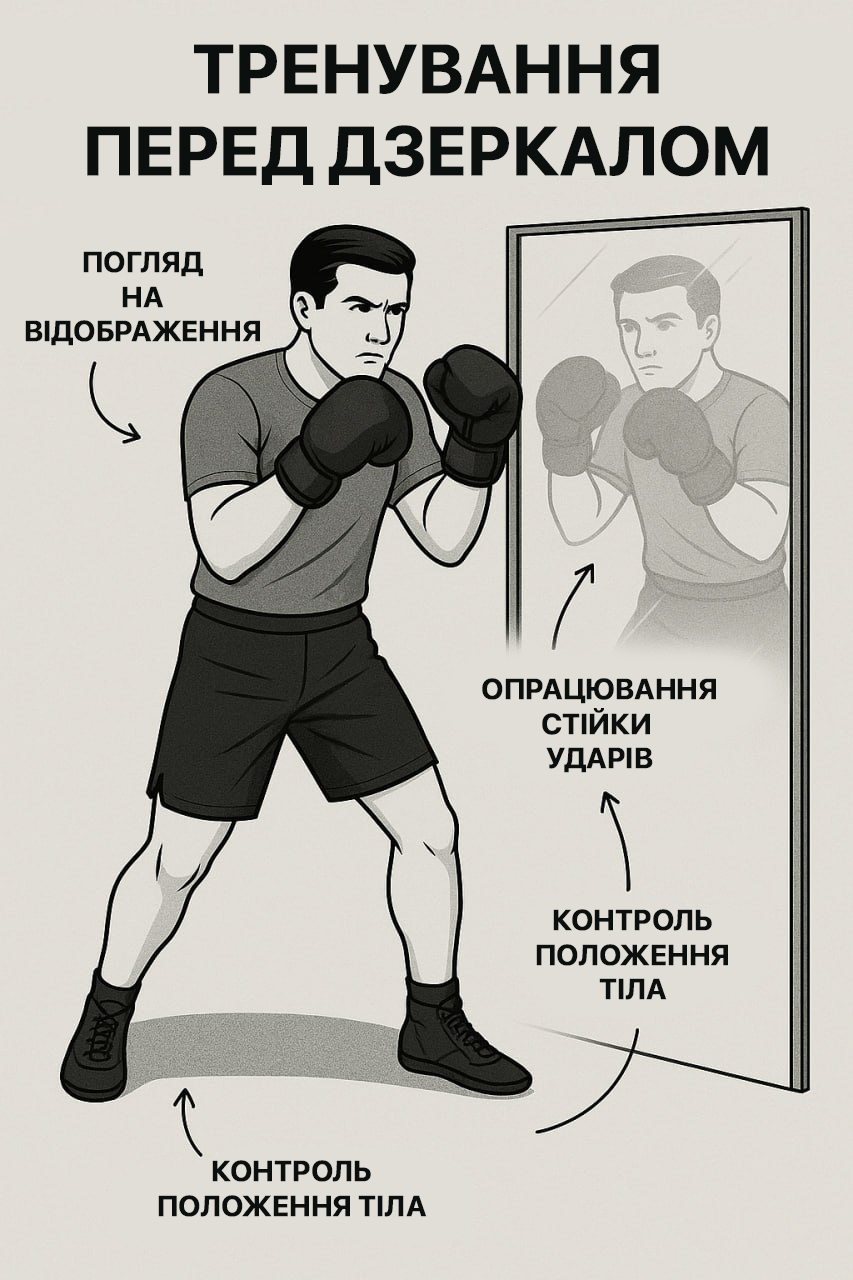 Постав дзеркало на повний зріст і тренуй свою позицію. Перевір положення голови, плечей, рук, тазу, ніг. Це допомагає не просто стояти, а усвідомлювати кожну частину тіла у моменті. Для початківців це особливо важливо.
