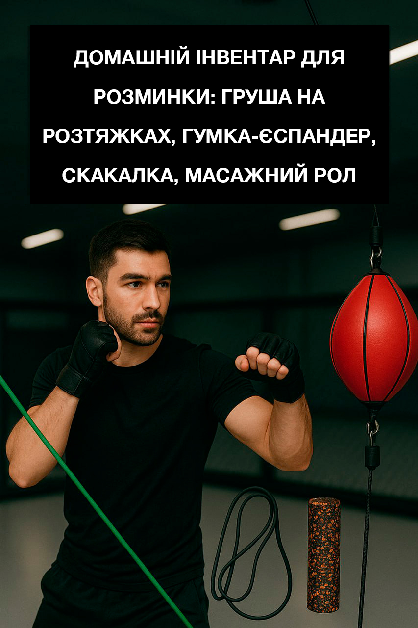 Для домашніх тренувань підійдуть прості інструменти: боксерська резина, еластична стрічка, міні-груша на розтяжках, скакалка. Ці елементи дозволяють прокачувати бійцівські навички навіть у невеликому приміщенні.