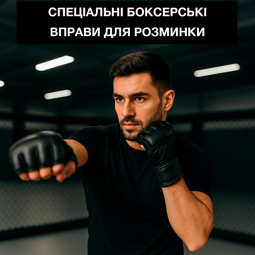 - Спеціальні вправи (7-10 хв): Shadow boxing (2-3 раунди по 2 хв). Джеб-крос-хук - по 4-5 серій по 30 сек. Еспандер або резина: вправи на плечовий пояс (2 підходи).